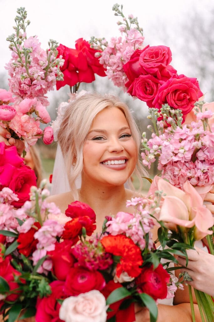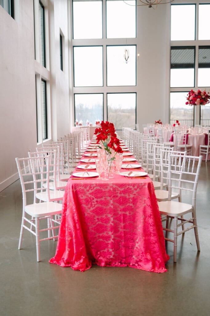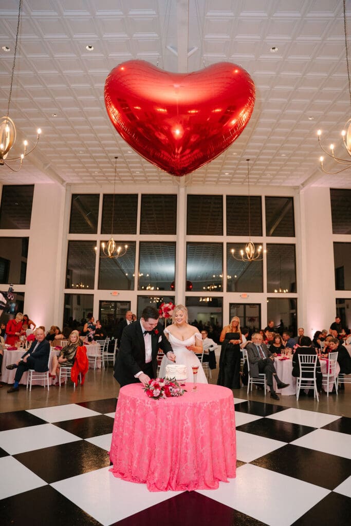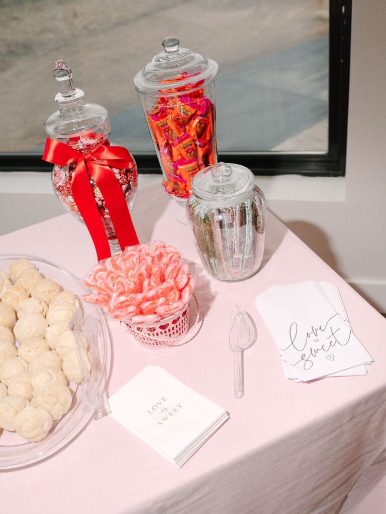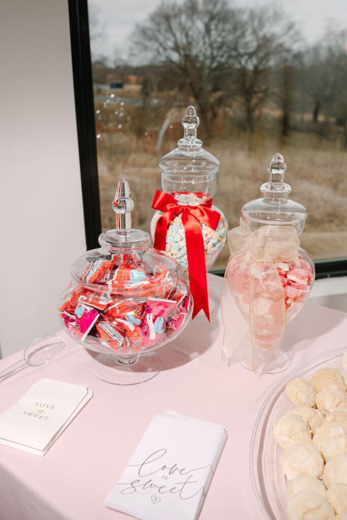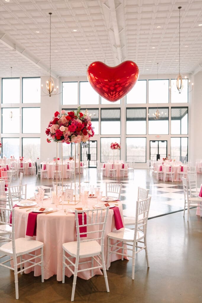 Their wedding took place at Osage House in Cave Springs. A blank white canvas was then filled with bright pink linens and tableware, gorgeous red & pink florals, and candy and sweets! At the center of the room hung a giant red heart as the staple to the day. The perfect touch for a day based on love!