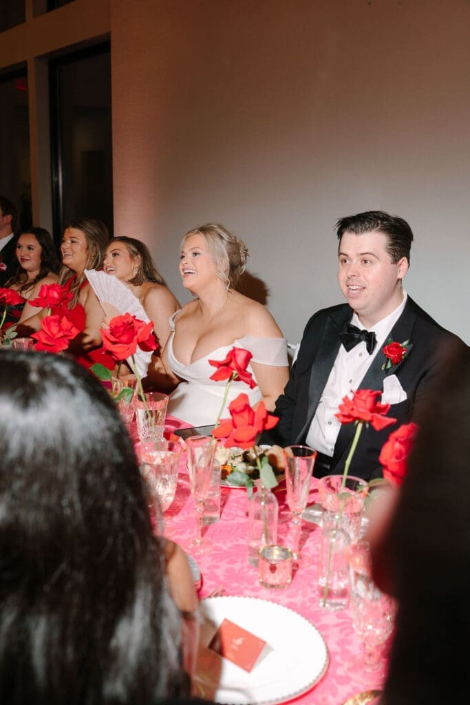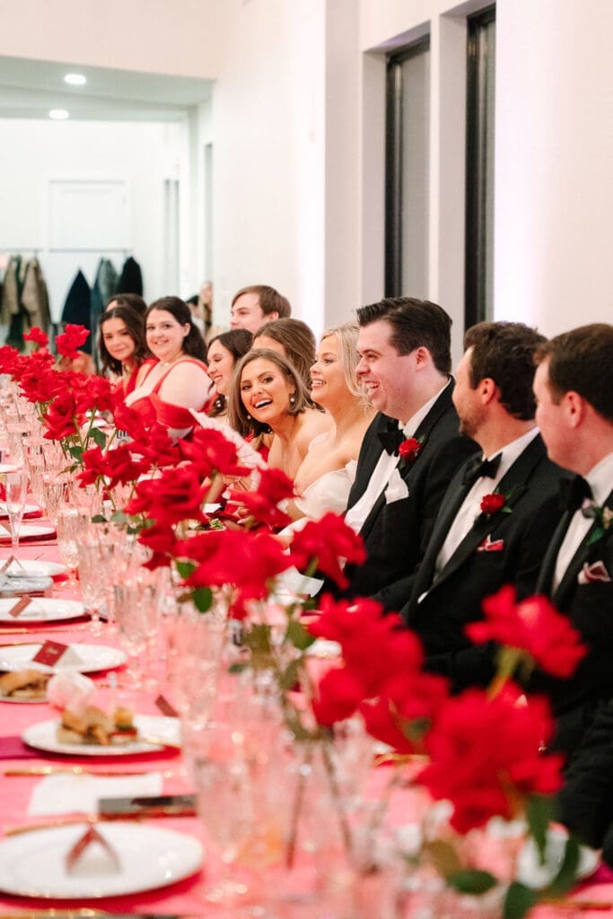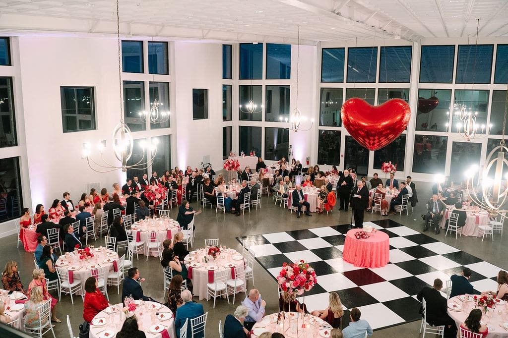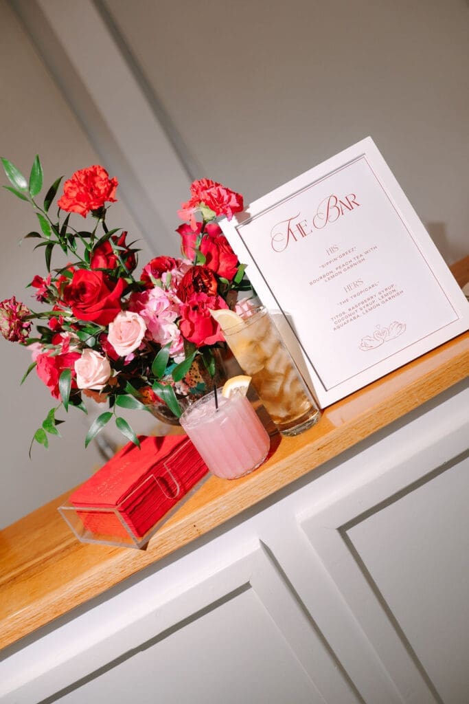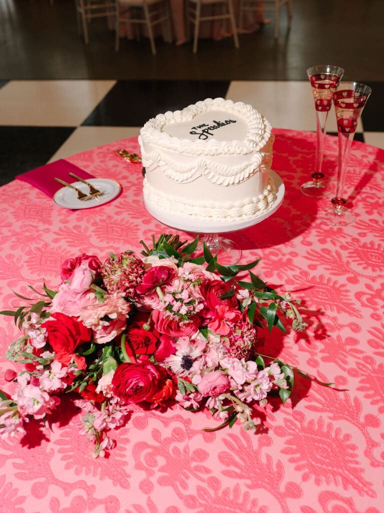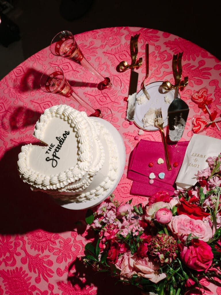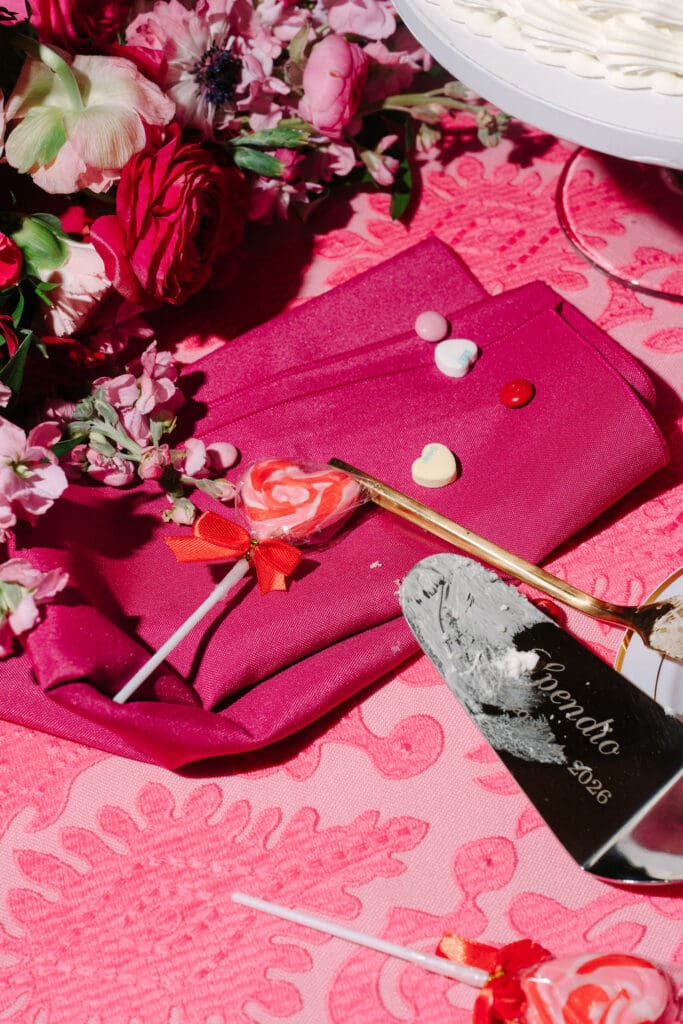 Their wedding took place at Osage House in Cave Springs. A blank white canvas was then filled with bright pink linens and tableware, gorgeous red & pink florals, and candy and sweets! At the center of the room hung a giant red heart as the staple to the day. The perfect touch for a day based on love!