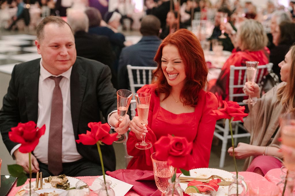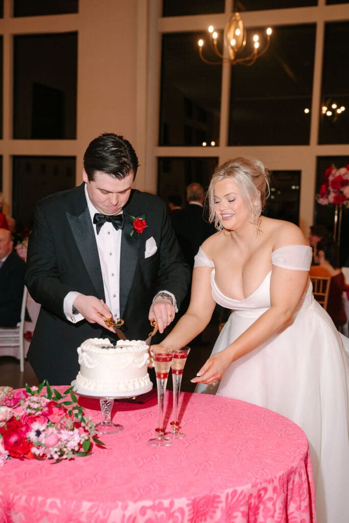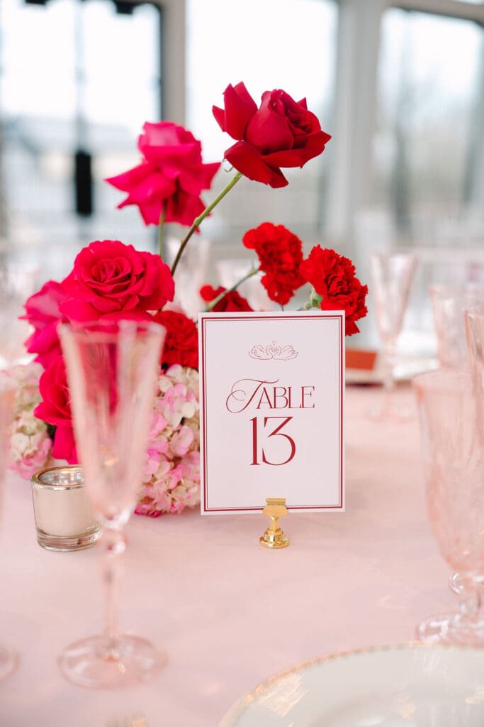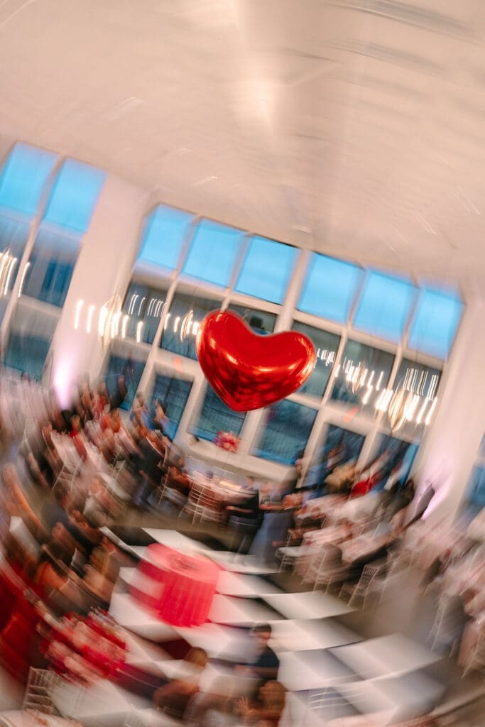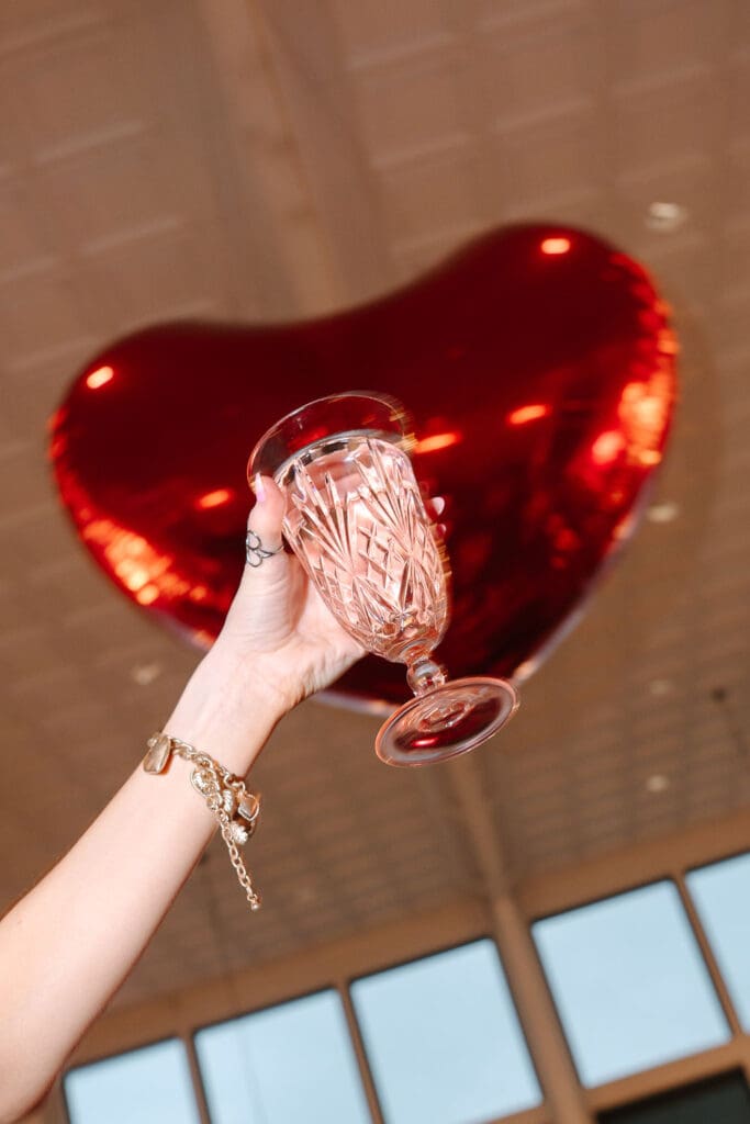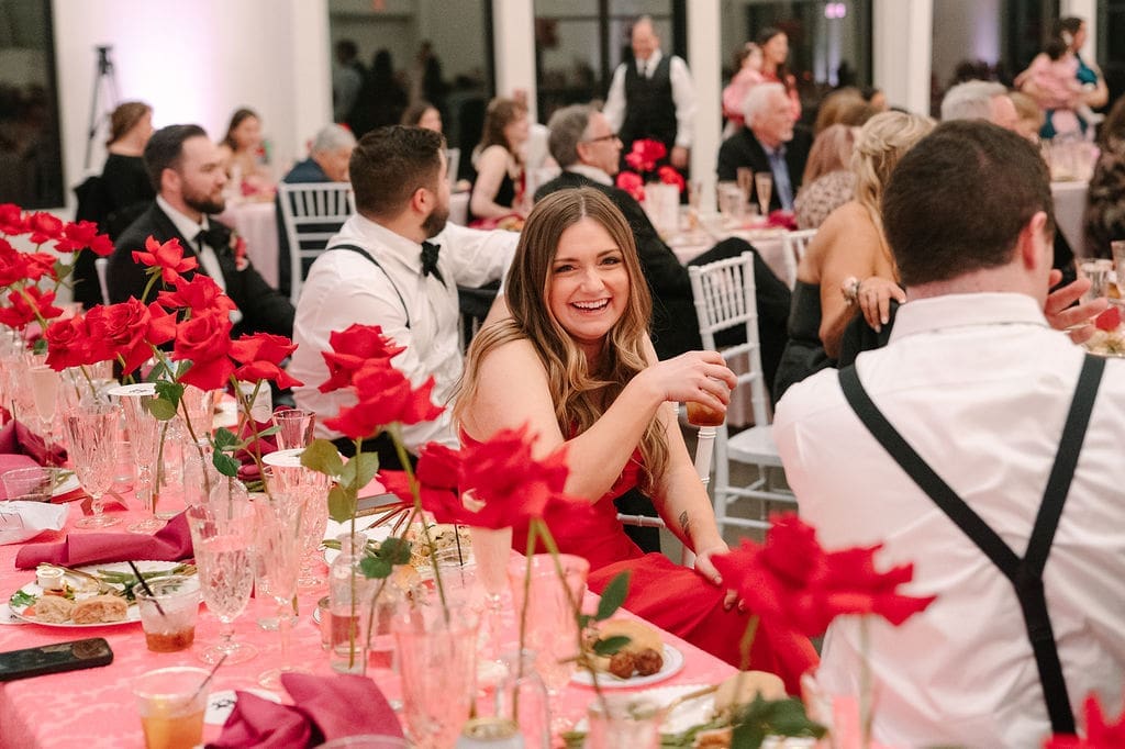 Their wedding took place at Osage House in Cave Springs. A blank white canvas was then filled with bright pink linens and tableware, gorgeous red & pink florals, and candy and sweets! At the center of the room hung a giant red heart as the staple to the day. The perfect touch for a day based on love!