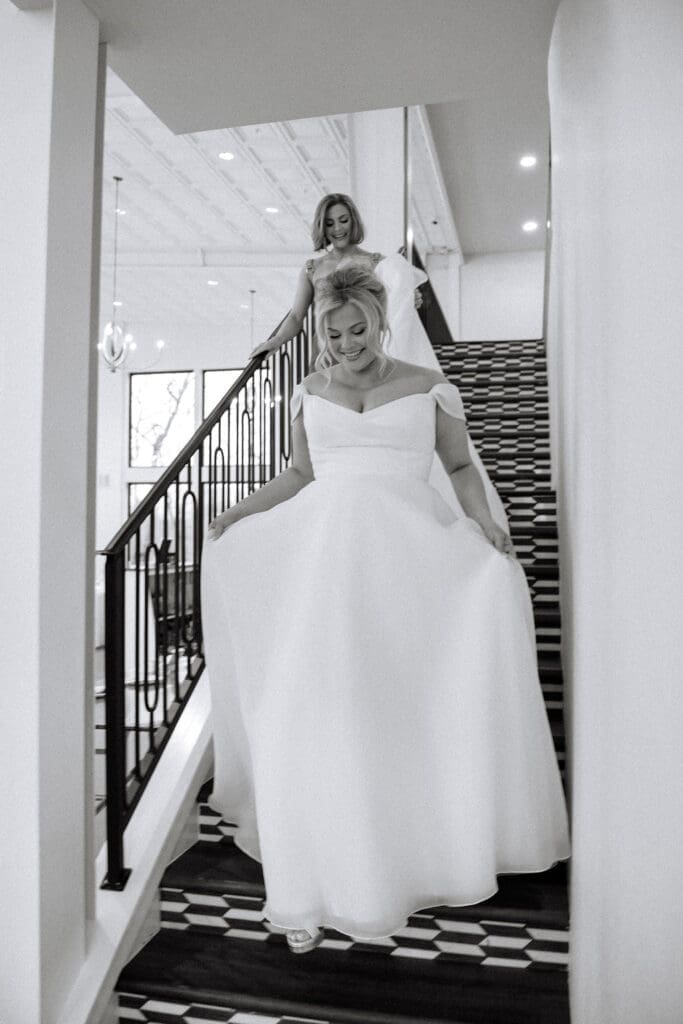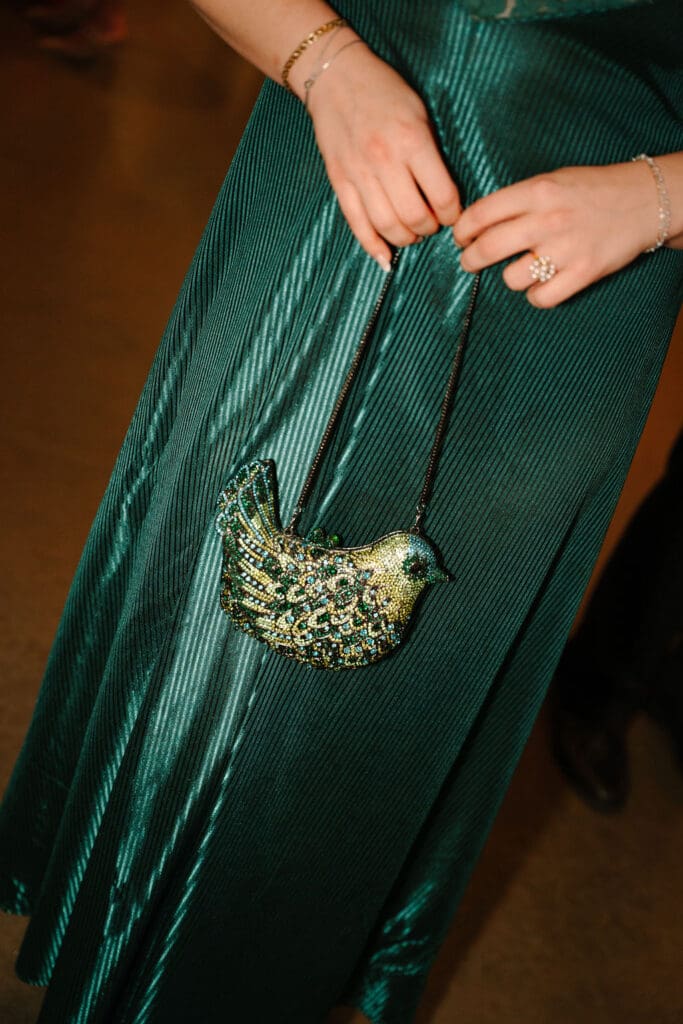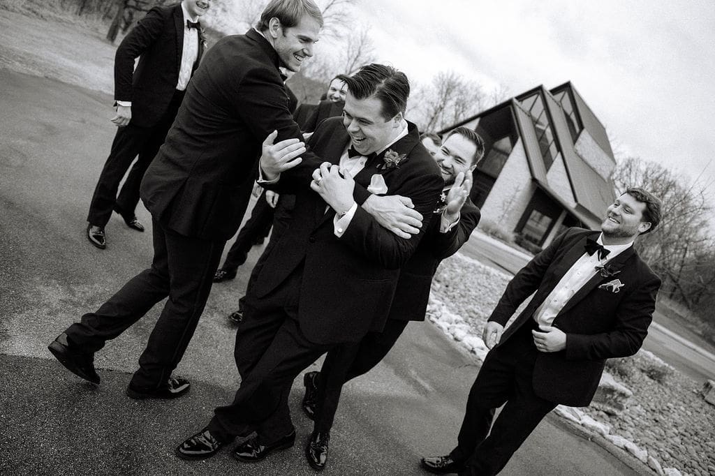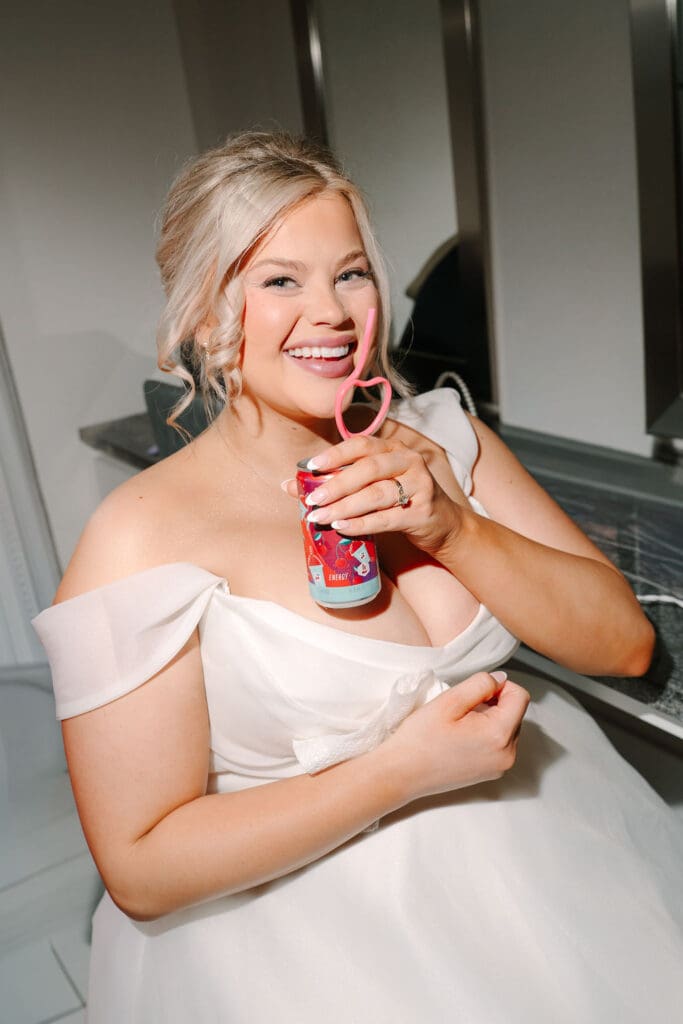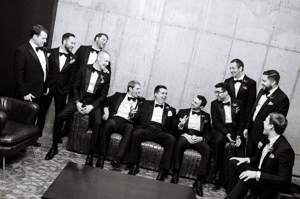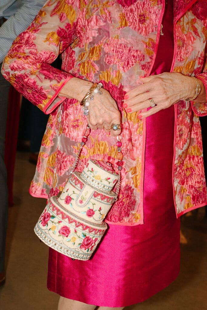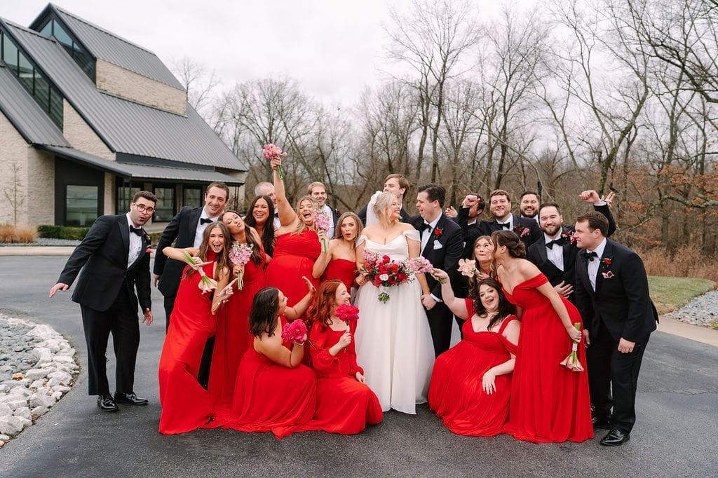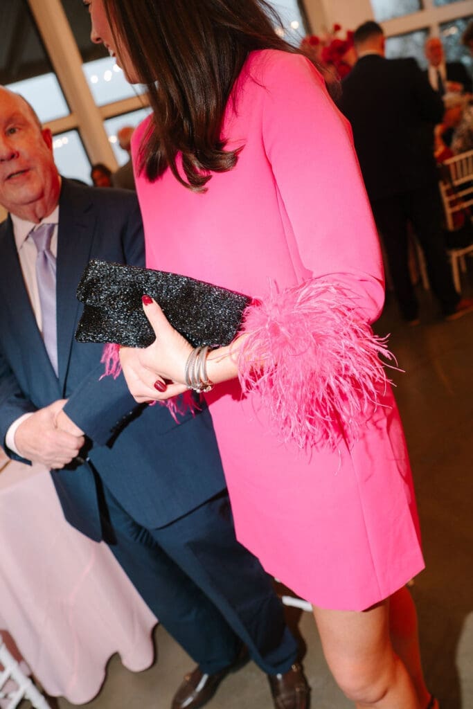 After the ceremony, and vows were exchanged, it was back to Osage House to celebrate with the entire wedding party. Everyone got to do their group shots, and take the time to enjoy before all the guests arrived back to the venue for cocktail hour. Can we also talk about how all the guests came decked out for this wedding. Including Gigi, with her all pink outfit and cake purse!