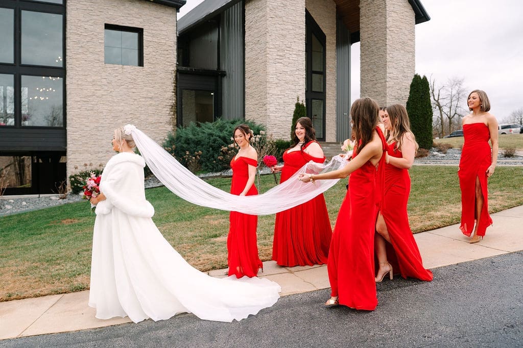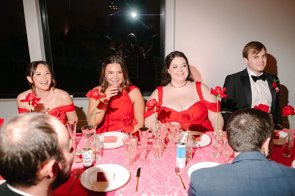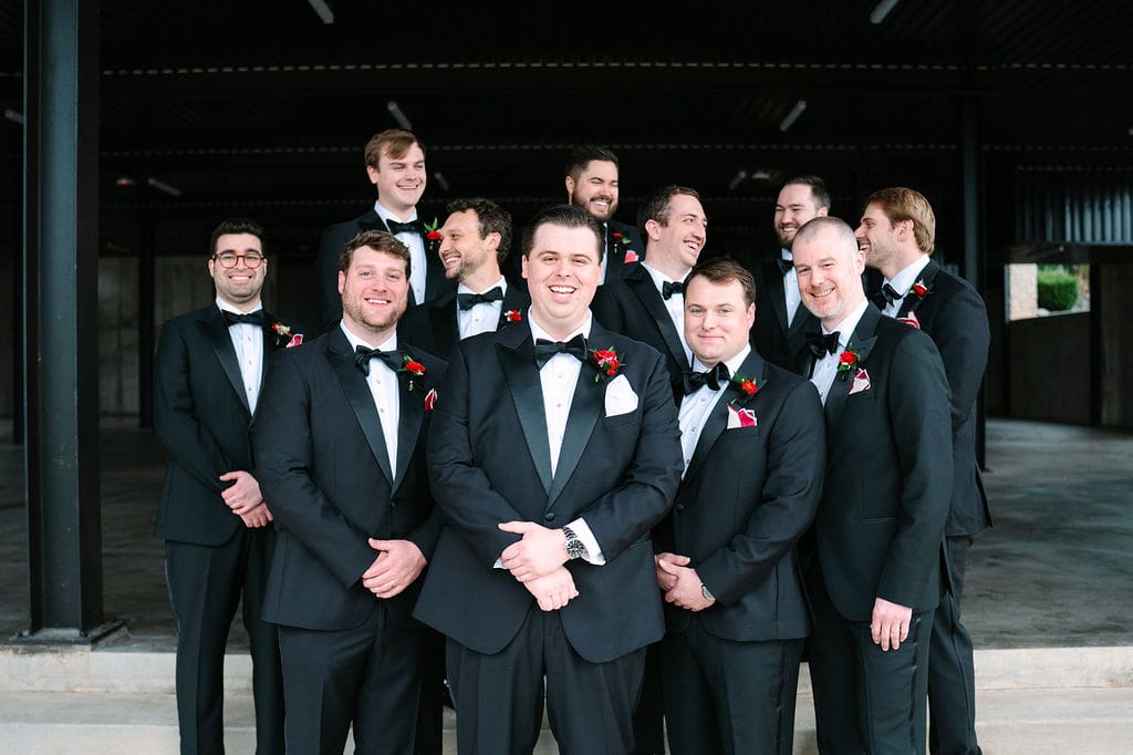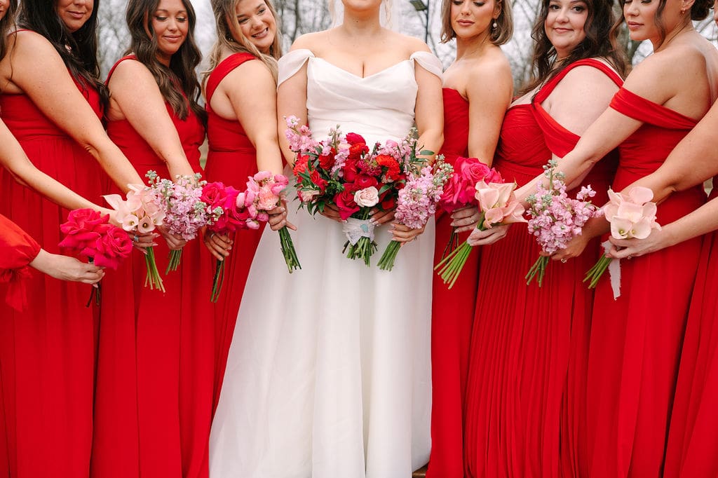 Caroline and Mikey started their day getting ready with their bridal party. The girls definitely partied and sang their hearts out! And they all wore different styles of red bridesmaid dresses, which still coordinated seamlessly. Meanwhile the guys got ready in their classic black tuxedos with their red boutonnieres, which were a nice pop. From here, everyone got on shuttle to head to a church ceremony.