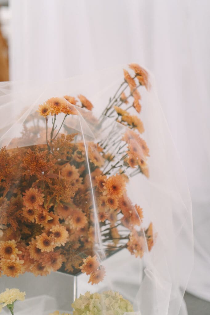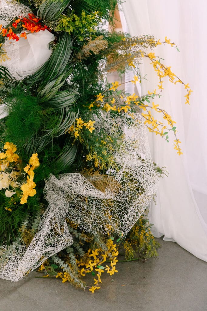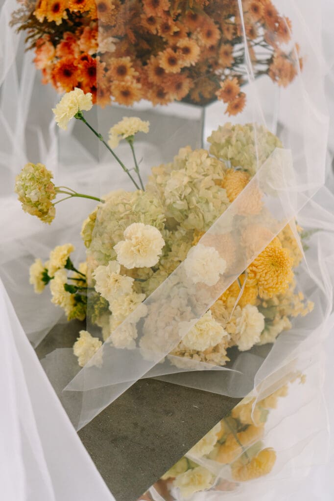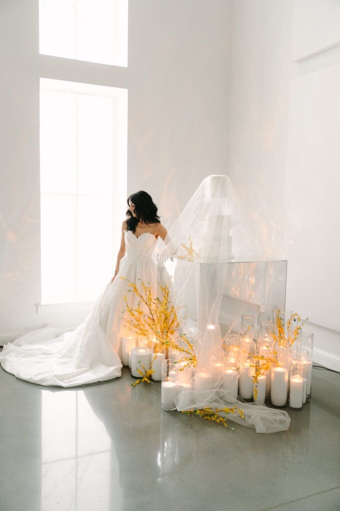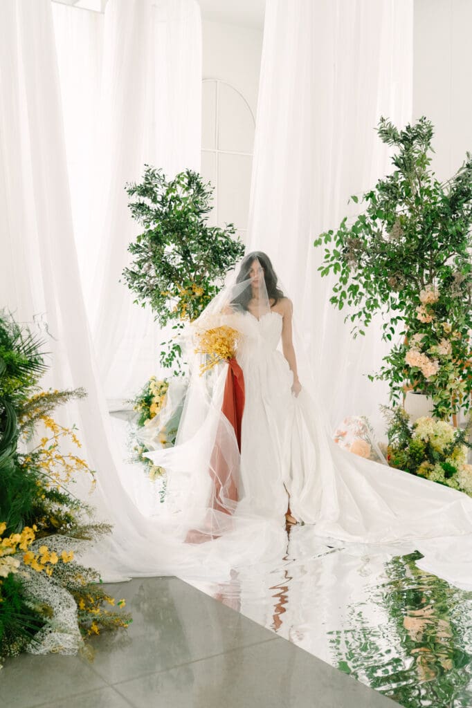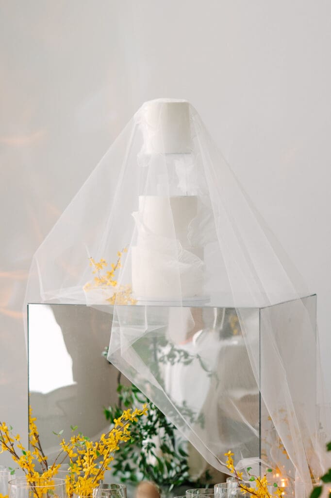 There were also beautiful concepts for reception/dinner seating. Lots of textures and bright yellow florals flowed down the center of each table, as crystal chandeliers hung over for an intimate and elegant experience. A true luxury experience. In the background, was a beautiful veiled cake, which looked like it was floating above the space. Surrounded by more florals, on a mirrored based, was the icing on the cake, no pun intended.