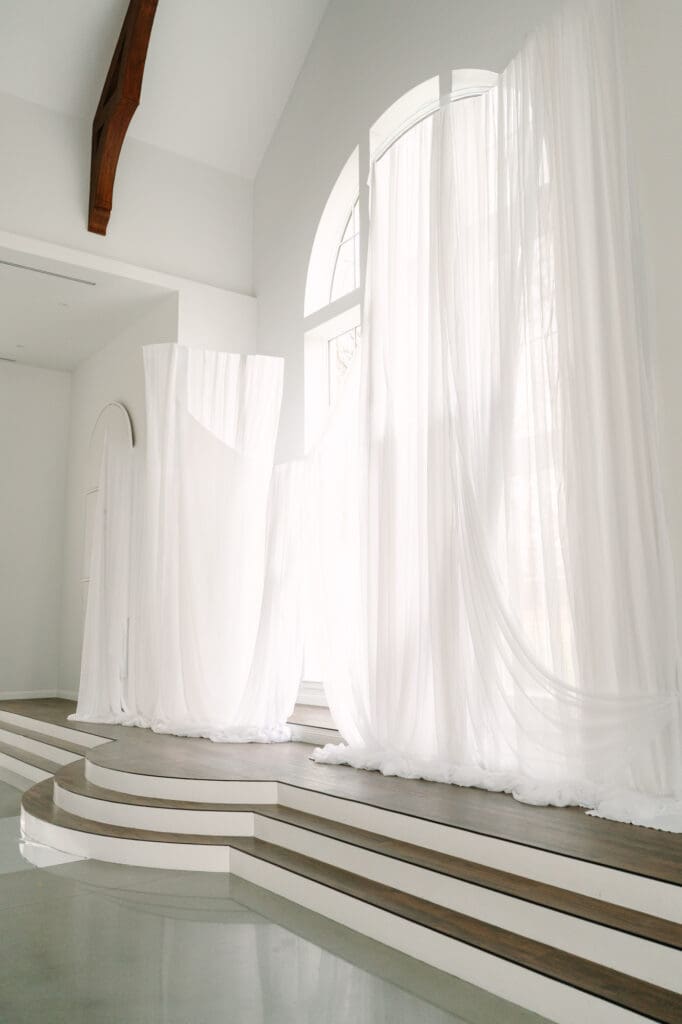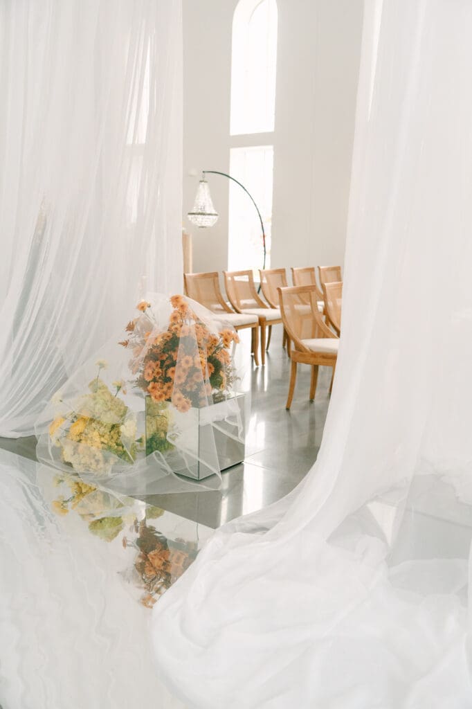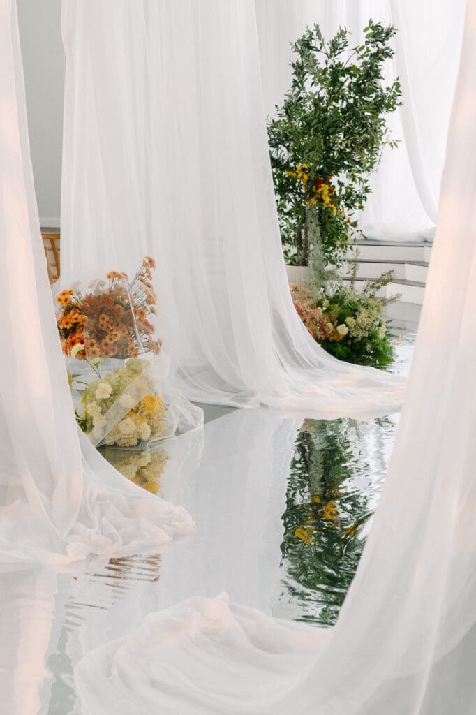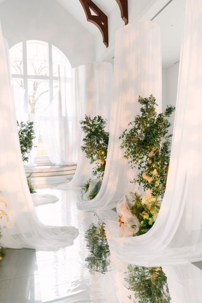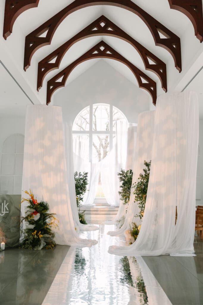 Gorgeous soft fabric floated and draped all the way down the aisle created for this set up. Mixed in with a mirror runner, trees and florals covered in layered tulle, with lights shining and creating shadows and dreamy patterns. The perfect dreamy design for what felt otherworldly.