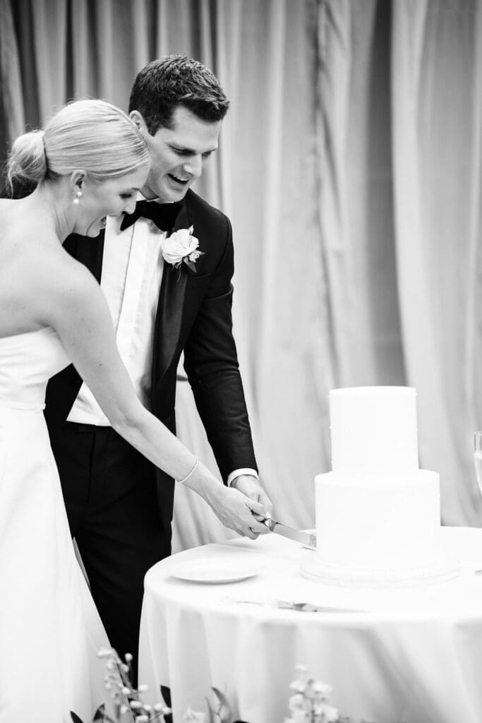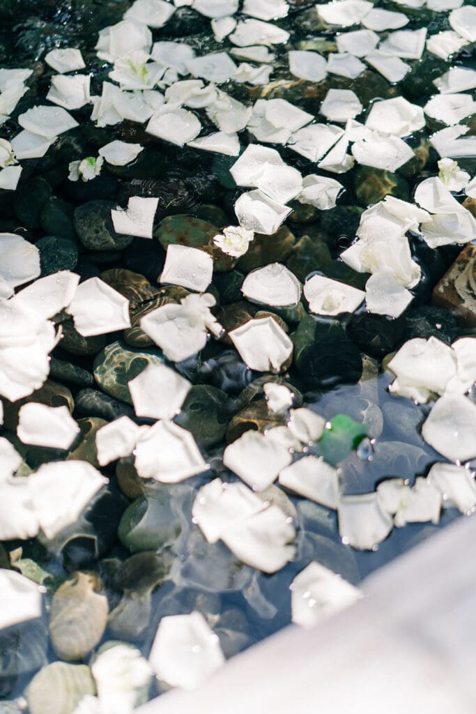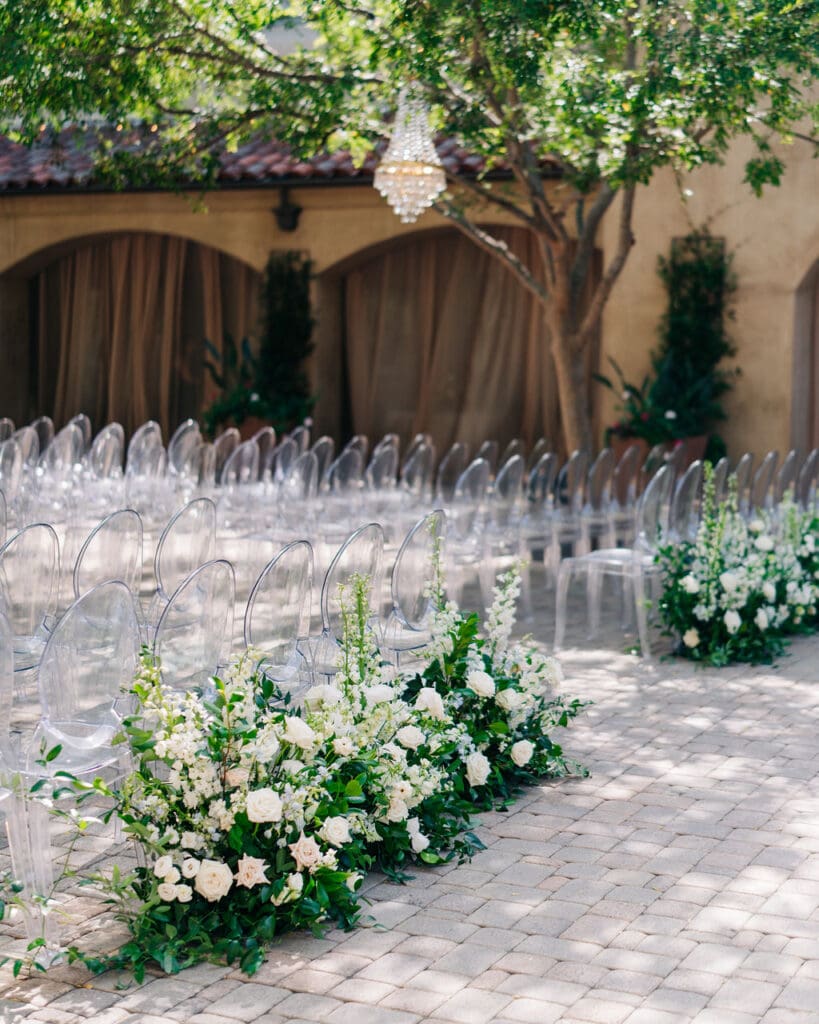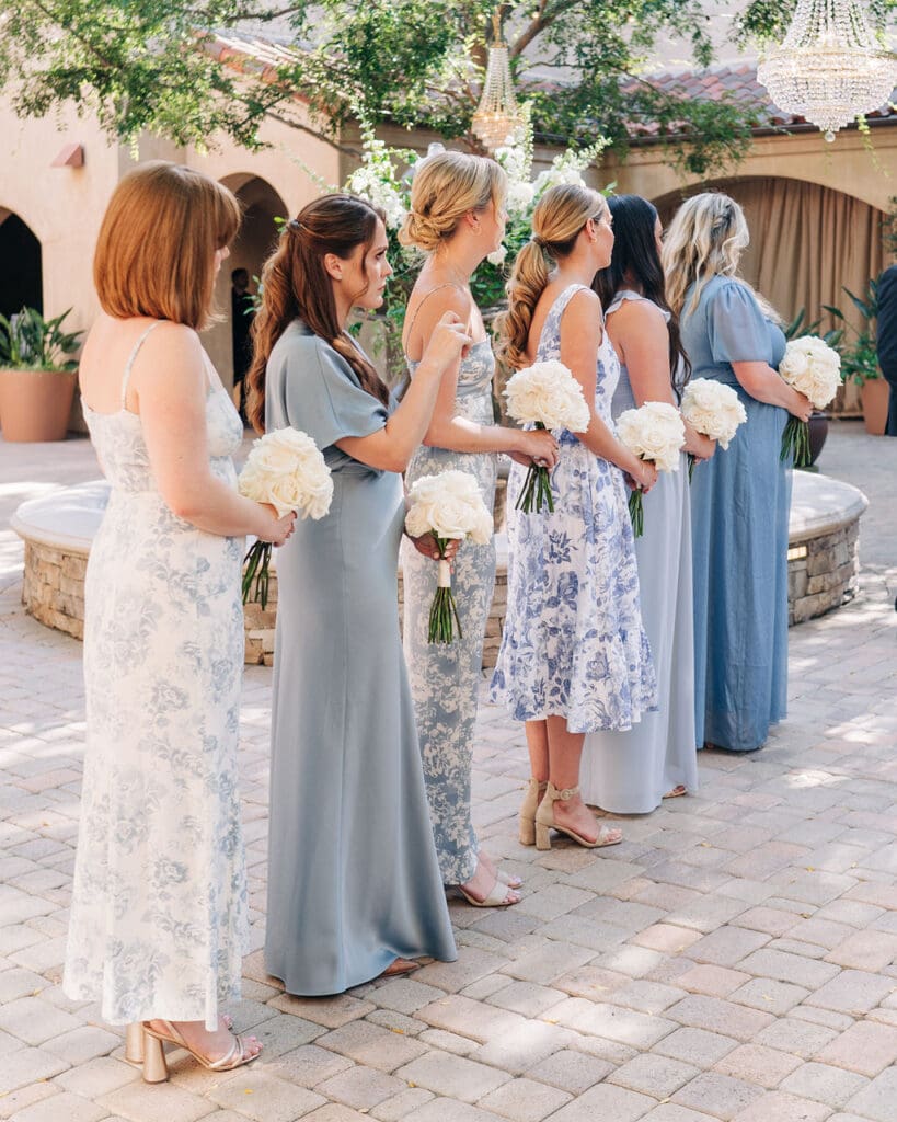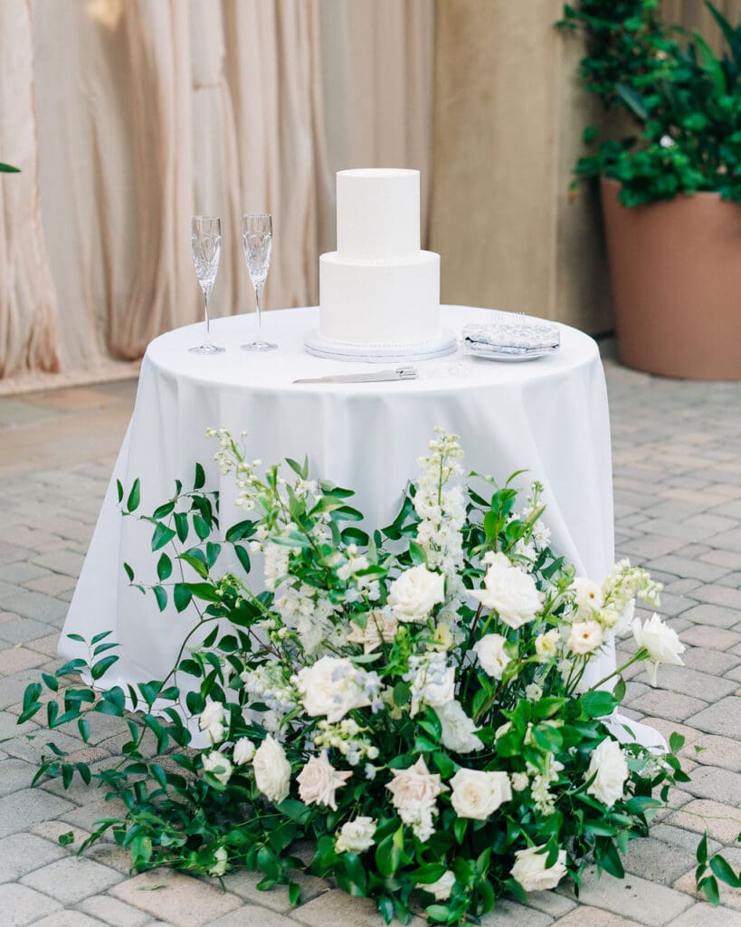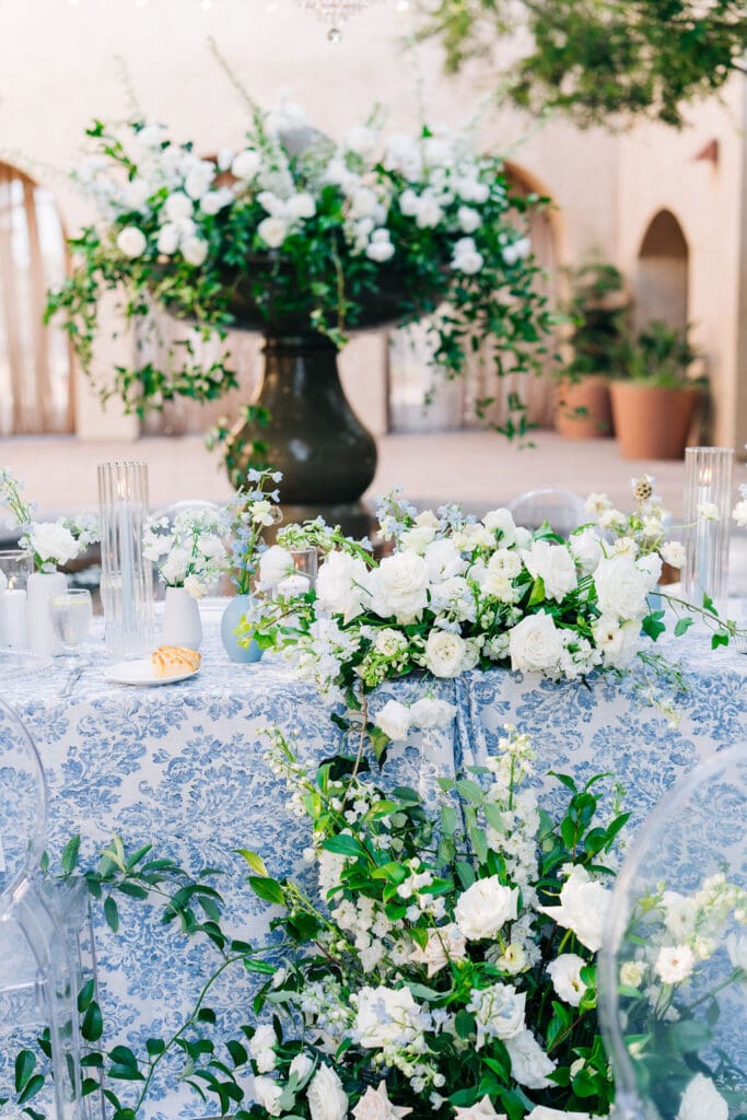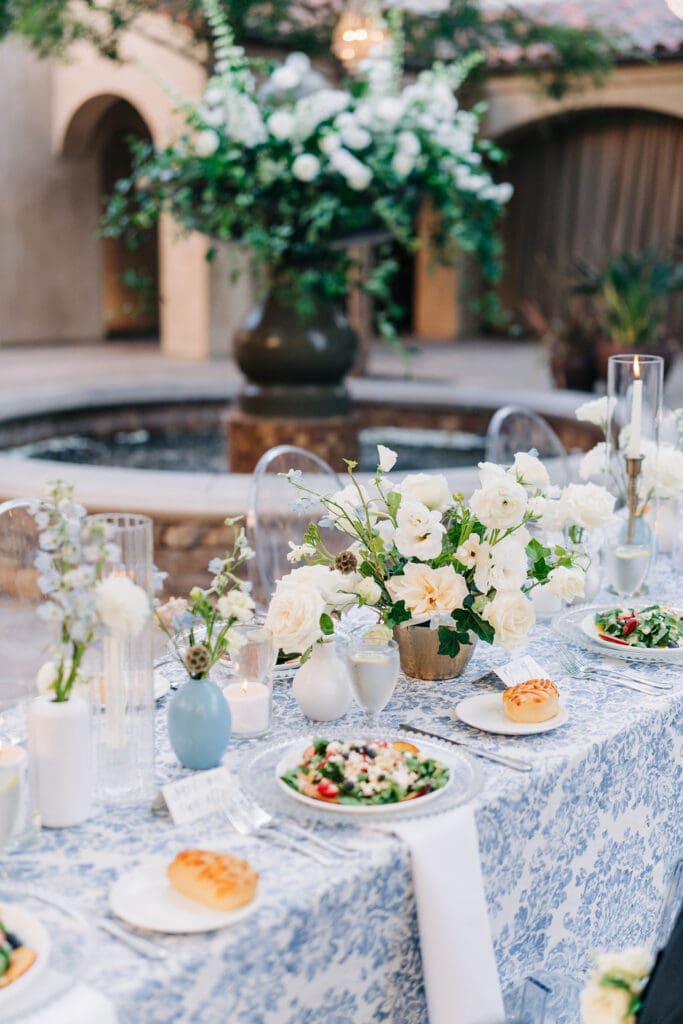 Their design details were nothing short of stunning. Soft blue toile accents brought a touch of vintage romance, perfectly complemented by lush white florals that felt crisp, classic, and effortlessly chic. Every corner of their celebration felt thoughtfully curated, from the intimate tablescapes to the gentle candlelight that filled the courtyard.